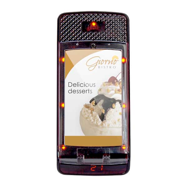 Ein handlicher Pager in der Größe eines Mobiltelefons, spritzwassergeschützt und vandalensicher. Der IQ Pager gibt ein Licht-, Vibrations- und/oder Tonsignal ab, die unabhängig voneinander eingestellt werden können. Standardmäßig sind die IQ Pager mit 60 Sekunden Vibrations-, Ton- und Lichtfunktion programmiert. Der IQ Pager arbeitet mit einem wiederaufladbaren Akku, der eine Lebensdauer von 3 bis 5 Jahren hat. Die Vorderseite des Pagers hat ein transparentes Fenster, hinter dem Sie ein Logo oder eine Anleitungskarte platzieren können.